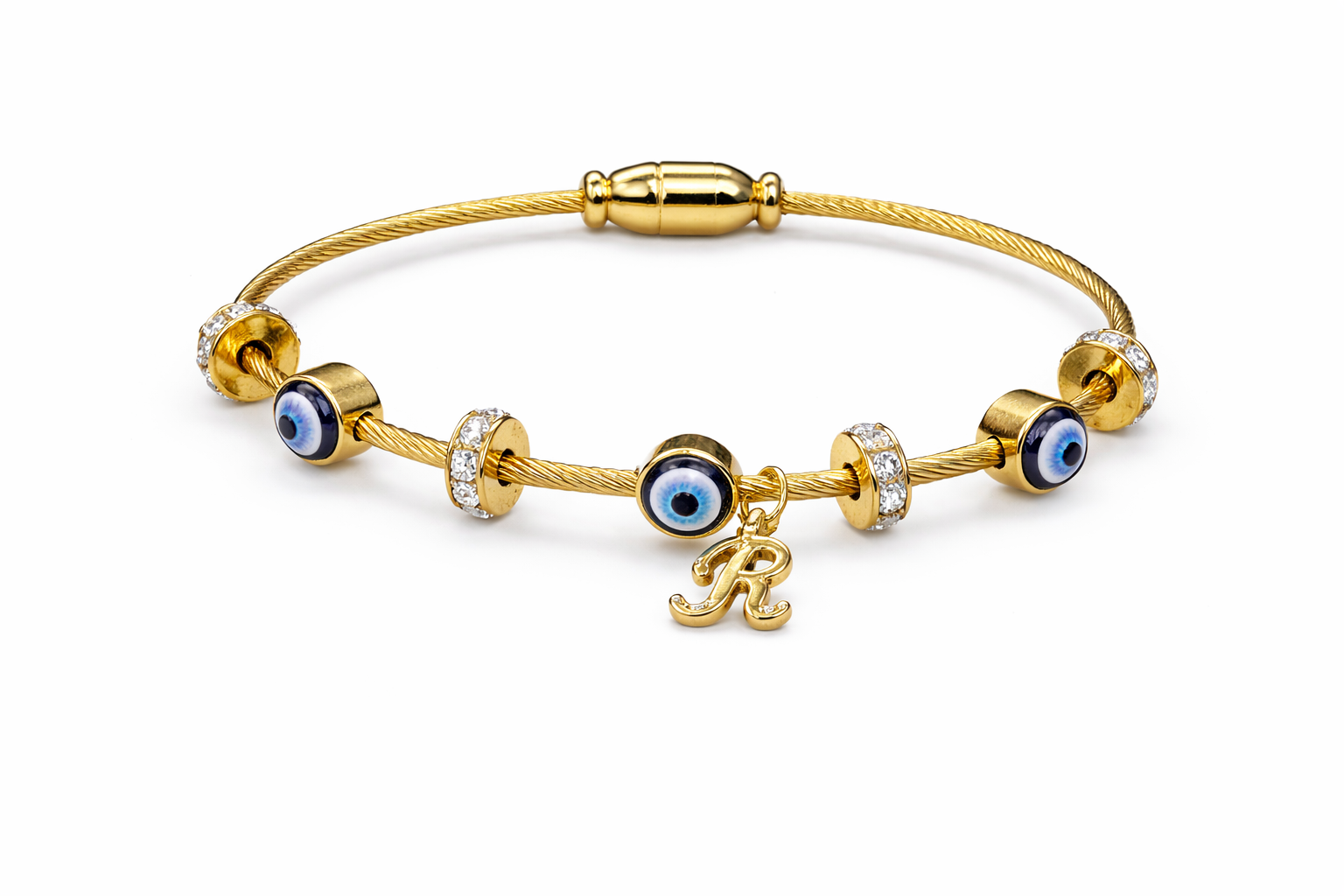 Wear your initial, carry your protection. This gold twisted cable bangle combines the ancient power of the evil eye with a personalised touch — your letter, your energy, your armour.